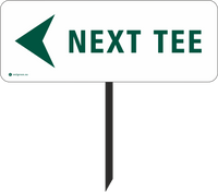 Hvidt golfskilt af sandwichplade med teksten NEXT TEE og pil venstre. 40 x 15 cm med stålspyd.