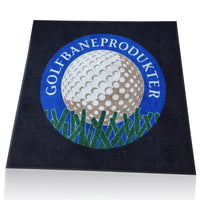 Logo and text included. Door mat size 90 x 90 cm made of 100% nylon with a 10 mm border. Can be washed at 60° C.